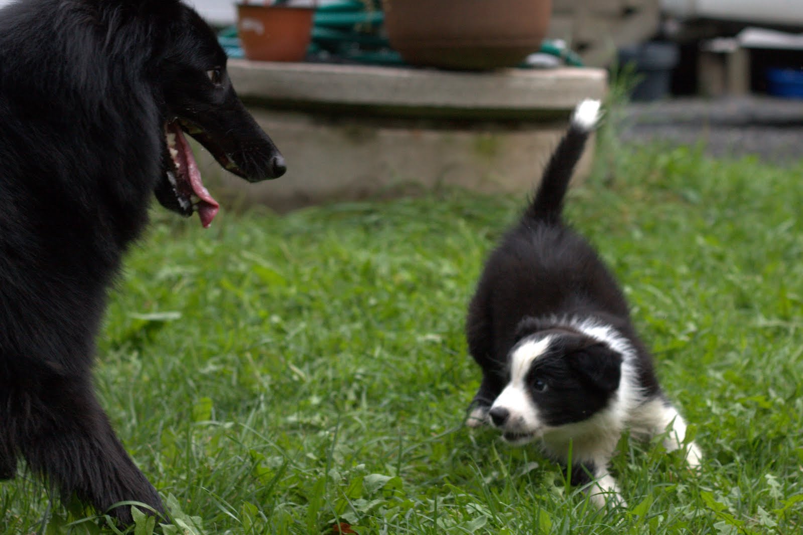 Wilma on jo aiemmin osoittanut arvonsa koiranpentujen arvonsatuntevana leikkitätinä, joten Pira pääsi sylissä sisälle, pylly Wilmalle haistettavaksi ja pentu lattialle. W oli hieman hämmentynyt, Pira olisi halunnut leikkiä :-D Kaiken kaikkiaan oikein onnistunut ensitapaaminen, jatketaan näitä harjoituksia tässä viikonlopun aikana vielä lisää. Nyt Nadi odotteli autossa, seuraavaksi täytyy siis pikkuhiljaa päästää koko lauma vapauteen. Eiköhän näistä oikein hyvä tyttötrio muodostu :)