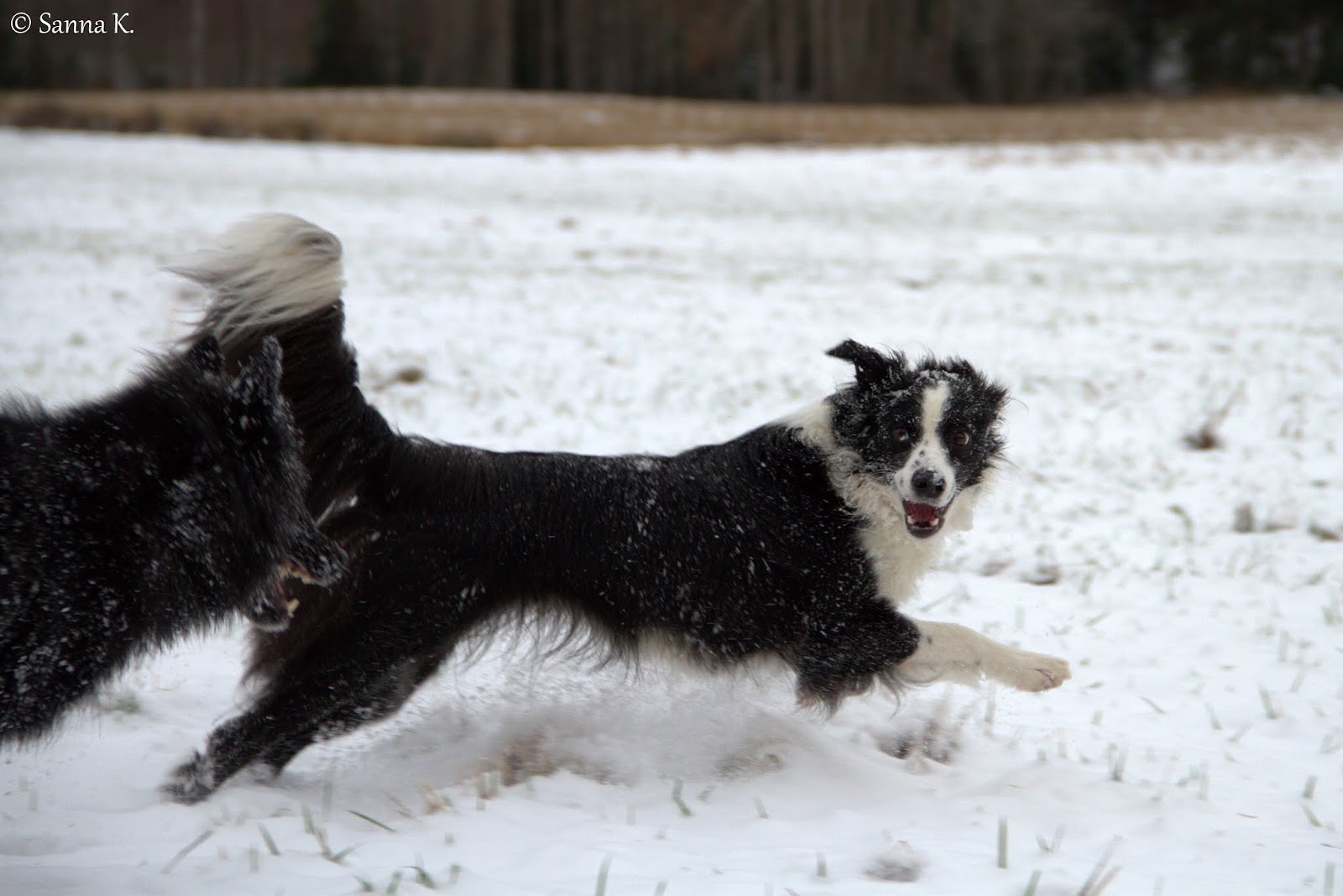 Ensilumi aiheutti jälleen lumihulluuden. Muutoin niin kovin fiksut koirani sukeltelivat, kierivät, söivät ja sekoilivat lumessa onnesta sekapäisinä. Harmi, että ehdittiin pihalle vasta iltapäivällä kameran kanssa, aamulla oli upea kuuran loisto, -10 C pakkasta ja joka paikka kimmelsi! Treeneihin oli kuitenkin mentävä, joten tässä tylsiä pilvisyyskuvia vaan tällä kertaa.